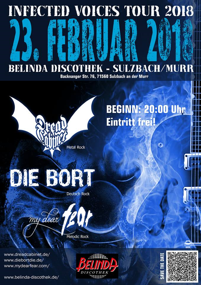 Am 23.02.2018 werden wir unsere Freunde von Dread Cabinet und Die BORT unterstützen; die Infected Voices Tour 2018 macht Halt in der Discothek Belinda in Sulzbach an der Murr.